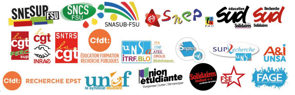 Nos organisations portent la parole des agents de l’ESR, leurs réalités professionnelles, et nos revendications pour un financement public de l’ESR à la hauteur des missions de formation, de recherche et pour améliorer les conditions de travail des agent·es et d’étude des étudiant·es.